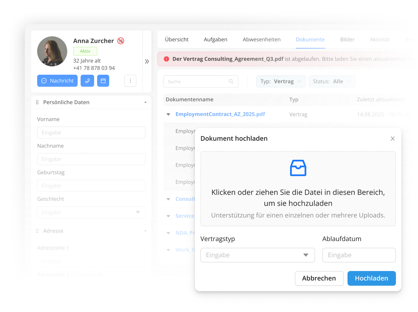 - Verwalten Sie Dokumente wie Zertifikate oder Verträge in der Dokumentenablage ihrer Mitarbeitenden.