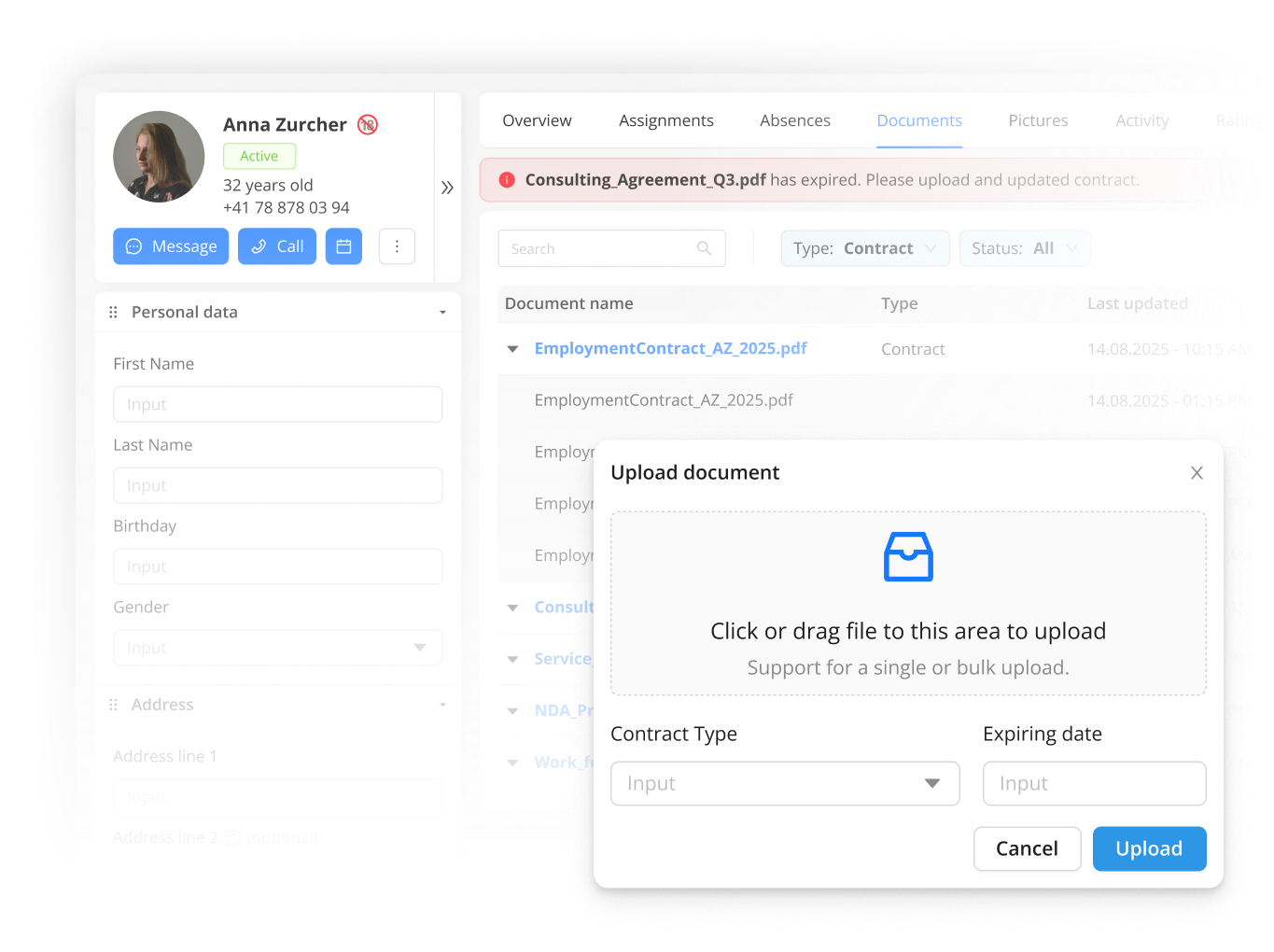 - Manage documents such as certifications and work agreements in digital personnel files.
